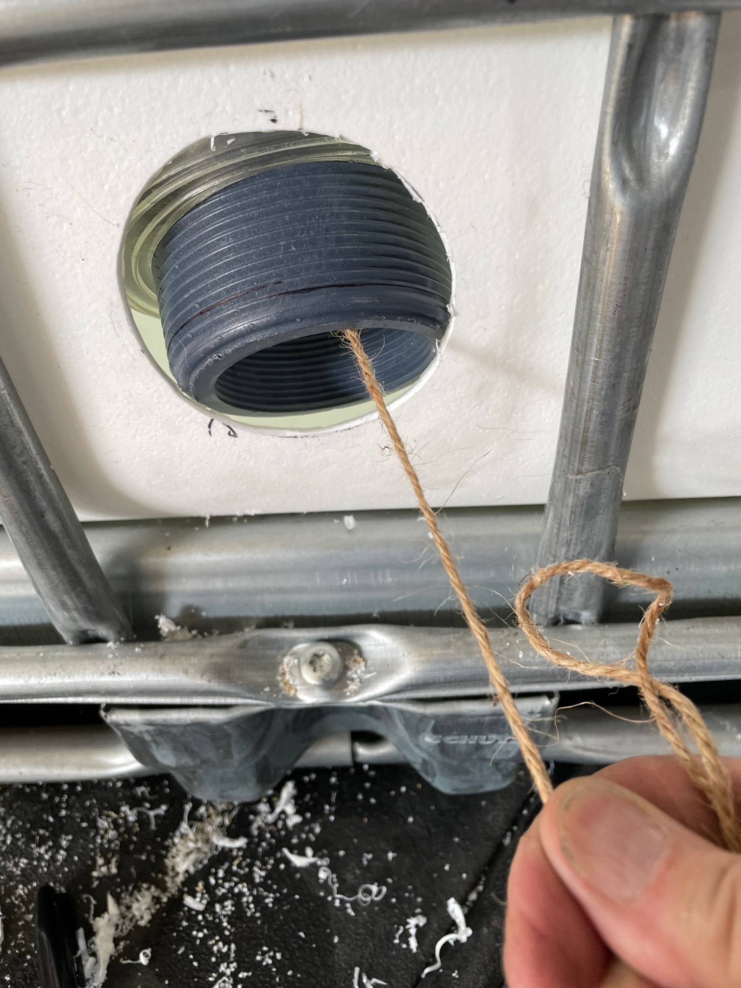 Start by drilling a hole in your tank where you want the new outlet. I used a 2 inch bulkhead fitting - it needs a three inch hole.  Then thread a piece of string from the new hole to a tank opening, Put the thread through the male portion of the bulkhead fitting with the threaded side towards the hole.