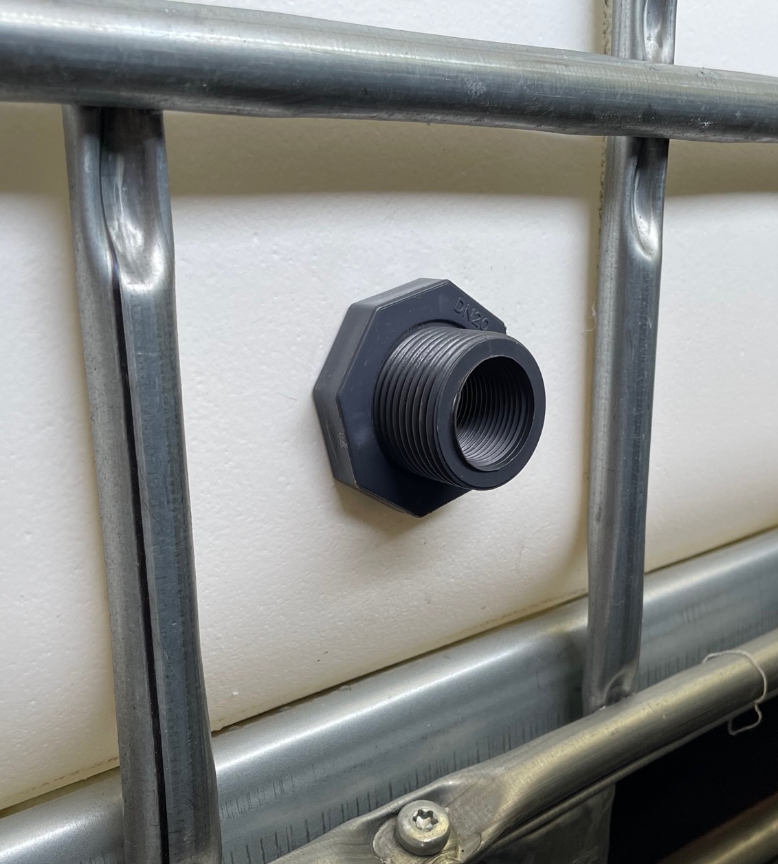 Don't drill a hole and try to screw a hose bib into it. The tank wall is thin and the connection will leak. And don't try to rig up some sort of gasket and PVC pipe connection - it will leak too. Just buy a couple of bulkhead connectors - this is the application they are made for. They are only about $10.