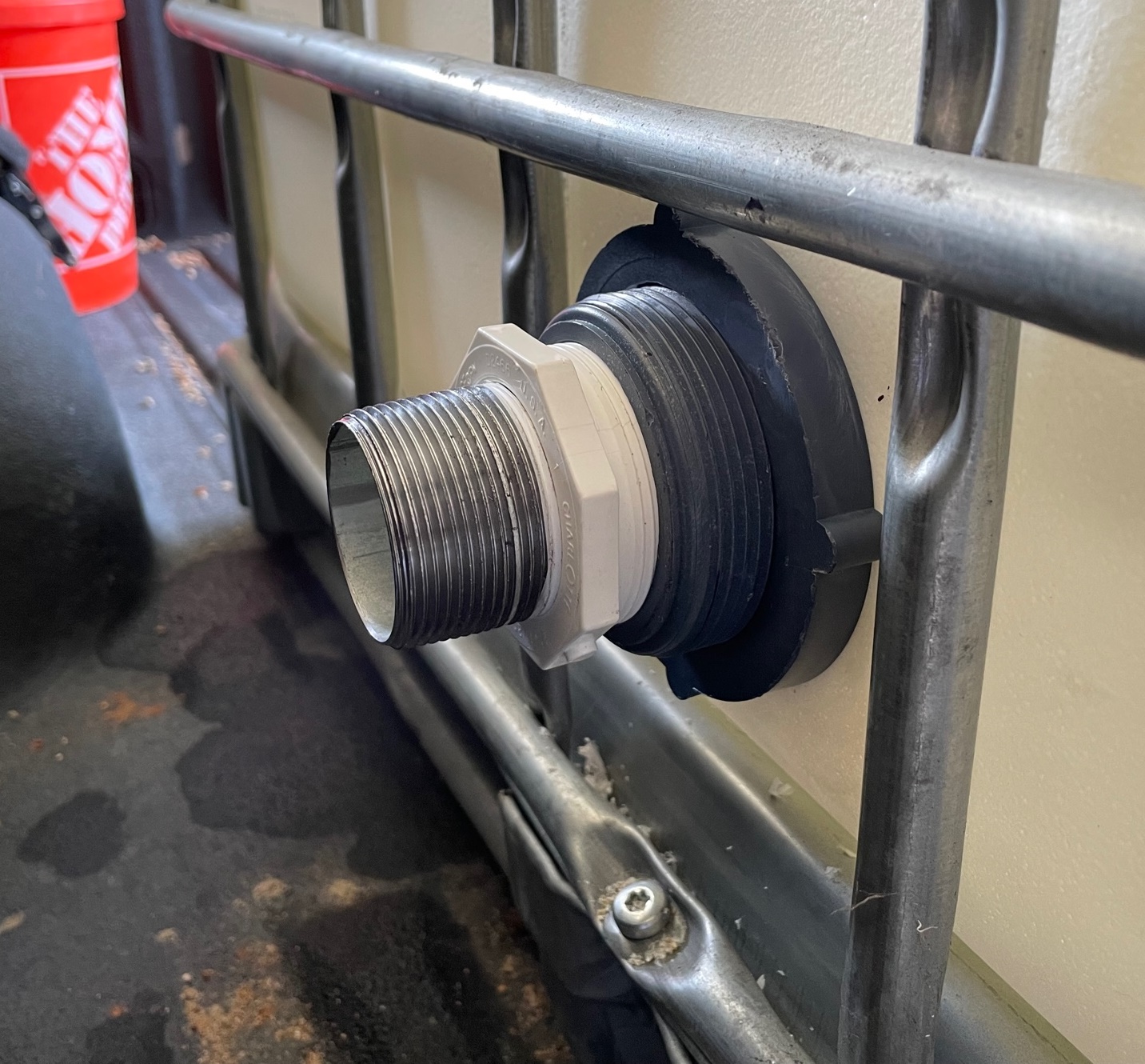 Depending on the size of your valve and other outlet fittings, you may need to install some reducer fittings. I used a 2 inch bulkhead fitting, so installed a 2 inch by 1-1/2 inch reducer bushing (white), then a metal 1-1/2 inch by 1-1/2 inch short nipple. Fire line