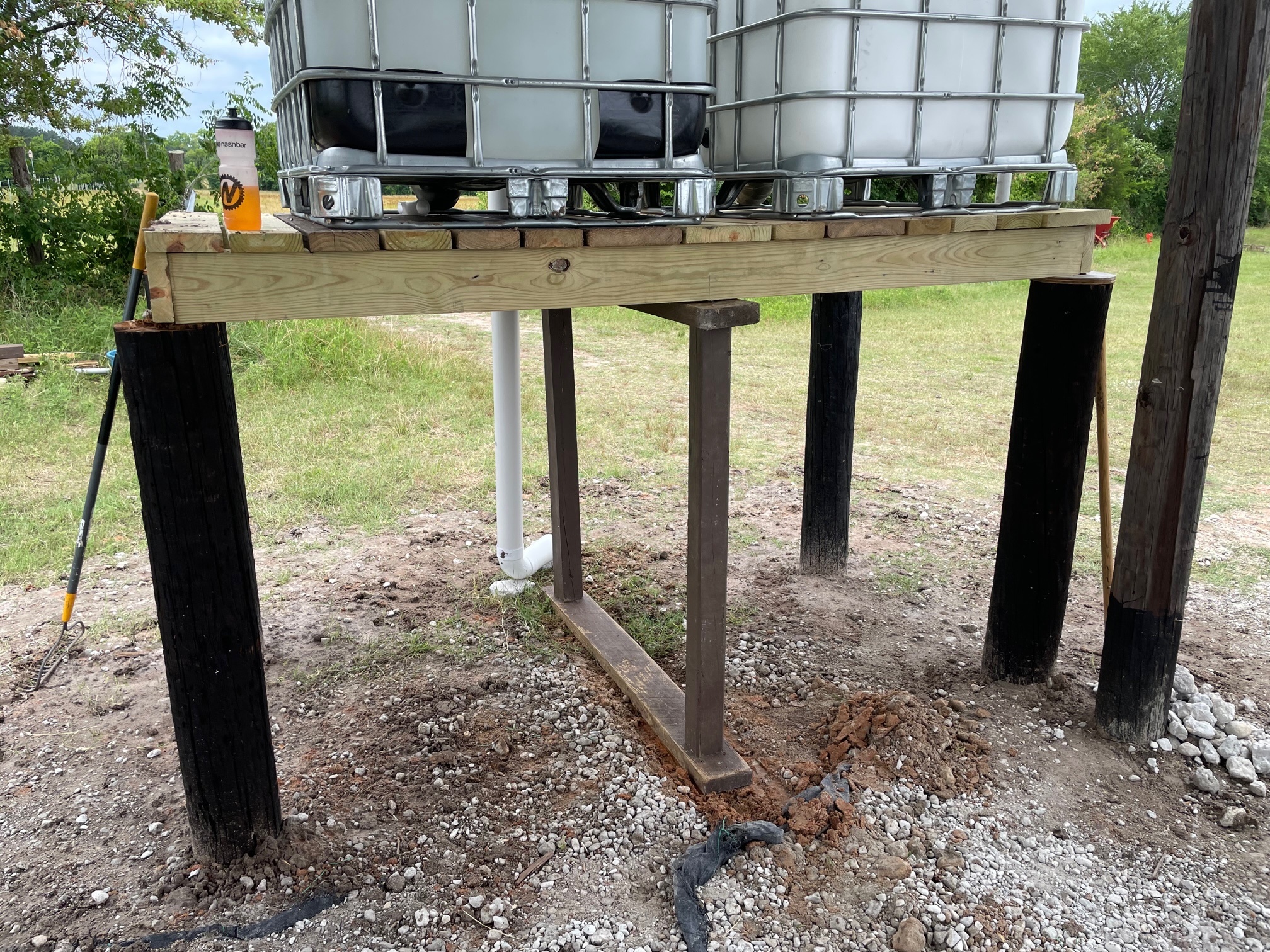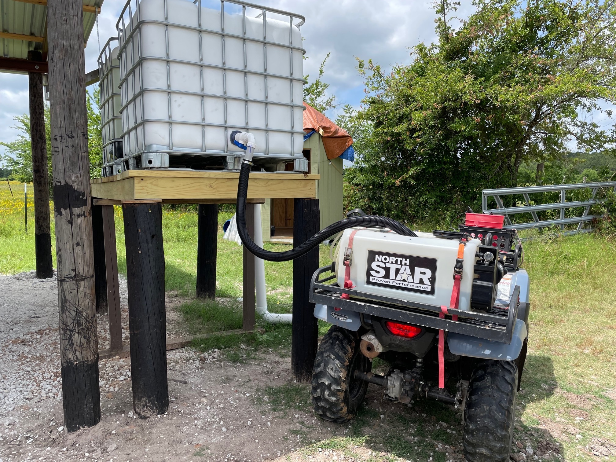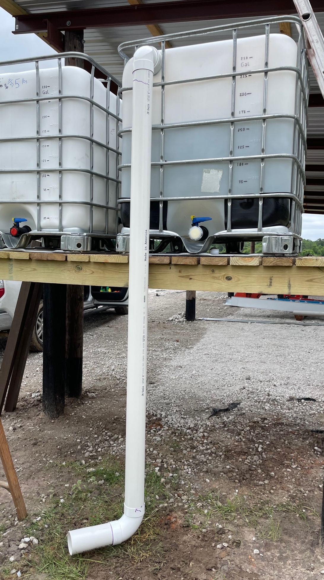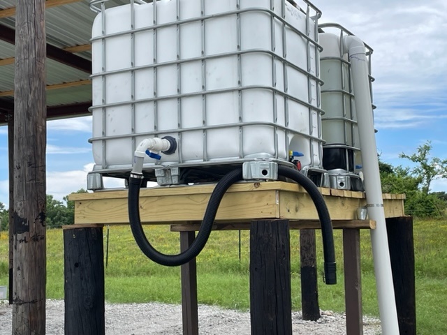 Frog Bottom Preserve does not have a water source clean enough to use for spraying, so decided to install a rainwater collection system. The spray system I use sprays about 25 gallons per acre. I'm currently spraying 5 acres to convert to native grass, and 15 acres for hay. So I need around 20 acrea X 25 gallons = 500 gallons when I spray. In addition, rain in this part of Texas can be very inconsistent, especially June through October, so need water for tree watering. I installed two 275 gallon tanks on an elevated platform next to my equipment storage shed to collect water off the roof. While there are two large ponds water can be taken from, that water tends to plug filters due to algae and small bugs. And it's a pain to use 5 gallon buckets to fill a 60 gallon sprayer!