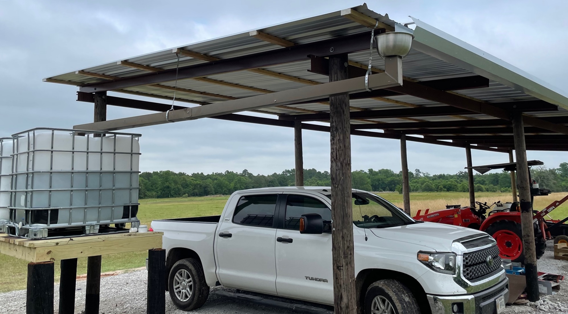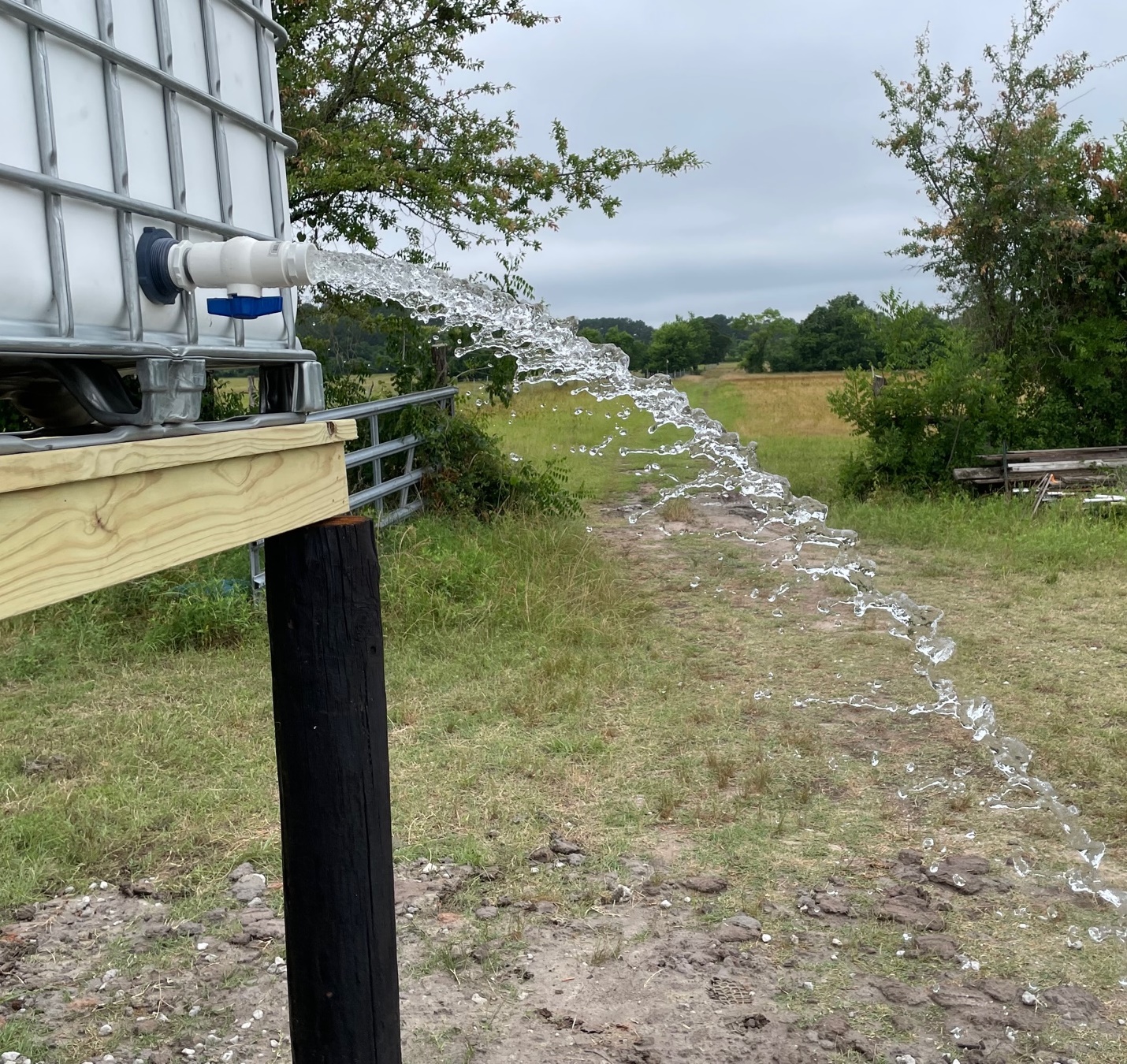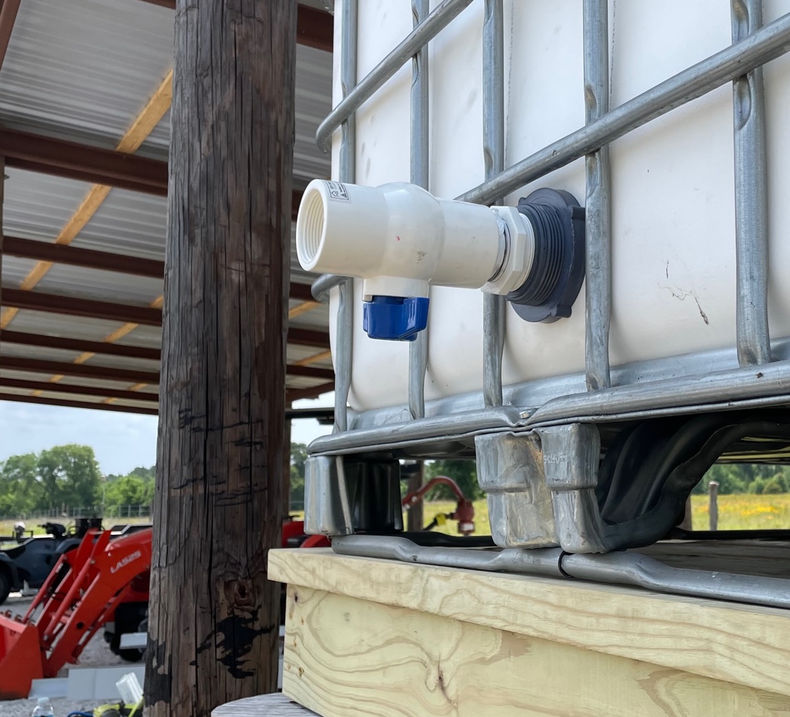 Frog Bottom Preserve does not have a water source clean enough to use for spraying, so decided to install a rainwater collection system. The spray system I use sprays about 25 gallons per acre. I'm currently spraying 5 acres to convert to native grass, and 15 acres for hay. So I need around 20 acrea X 25 gallons = 500 gallons when I spray. In addition, rain in this part of Texas can be very inconsistent, especially June through October, so need water for tree watering. I installed two 275 gallon tanks on an elevated platform next to my equipment storage shed to collect water off the roof. While there are two large ponds water can be taken from, that water tends to plug filters due to algae and small bugs. And it's a pain to use 5 gallon buckets to fill a 60 gallon sprayer!