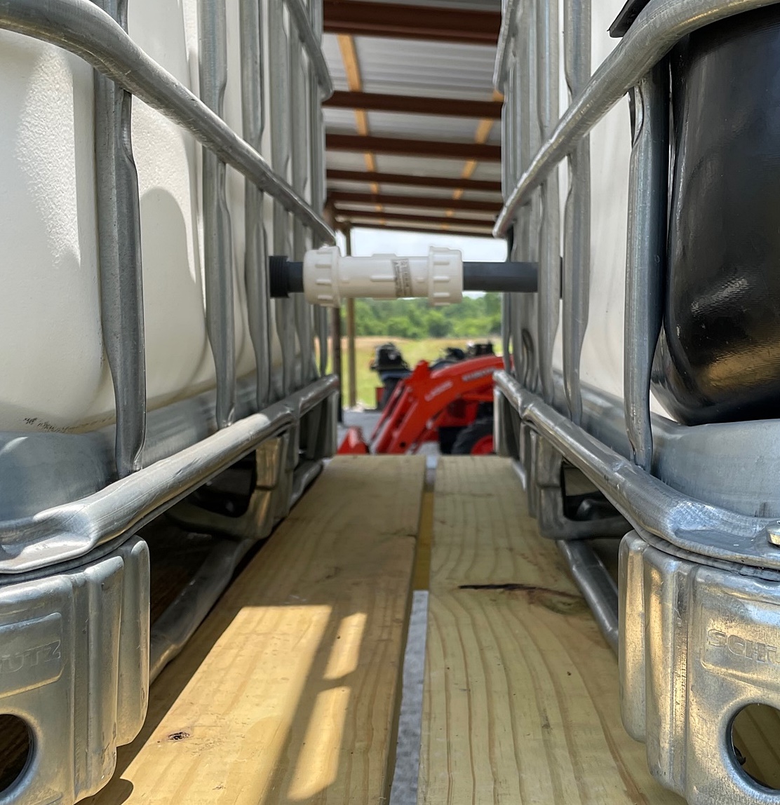 You don't need a large diameter connector pipe between tanks. There is plenty of water in the one tank to quickly fill a sprayer. Larger means greater chance of leaking so I tried to keep it no bigger than needed. Just don't want the pipe to get plugged up.