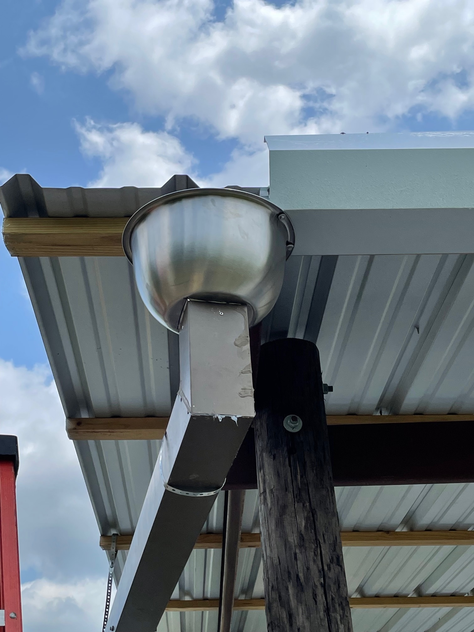So I did not install one of the gutter end caps - I want water to freely flow in the direction of the tanks and minimize the chance of rain water going over the top of the gutter. I bought a large stainless salad bowl at WalMart and fit it to a 4 inch square downspout. Two screws secure the bowl to the end of the gutter.