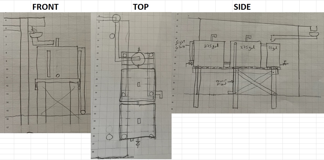 I wanted 500 gallons of storage capacity. There is a guy near my house that sells used drums and 275 gallon tanks. So I bought two of the tanks for $90 each, rinsed them out really well, and sat them on the elevated platform.