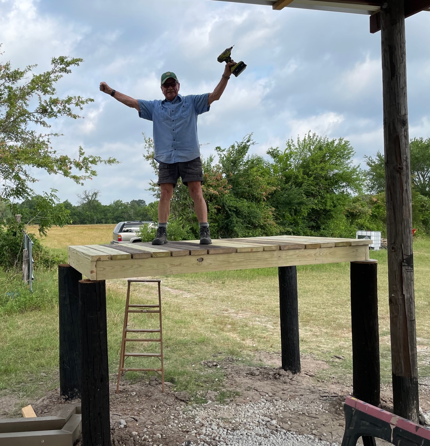 There are four 8 inch diameter telephone poles set 30 inches into the ground. 4x6x8 foot treated timbers are placed across the top of the poles and a lag screw holds them in place. The top is decked with 2x6 and 2x8 boards screwed to the 4x6s. My friend is doing a load test - he weighs 1/20th the weight of the water!